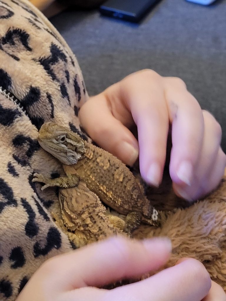 Sie wirken wie zwei sanfte Echsenköniginnen: zutraulich, ruhig und voller Vertrauen. Sie lieben es, sich auf eine warme Hand legen zu lassen, genießen Streicheleinheiten oder kuschelige Stoffe. Wenn sie versuchen, Insekten zu fangen, sind sie unbeholfen – fast trottelig. Und manchmal sieht es so aus, als würden sie mit uns zusammen fernsehen.